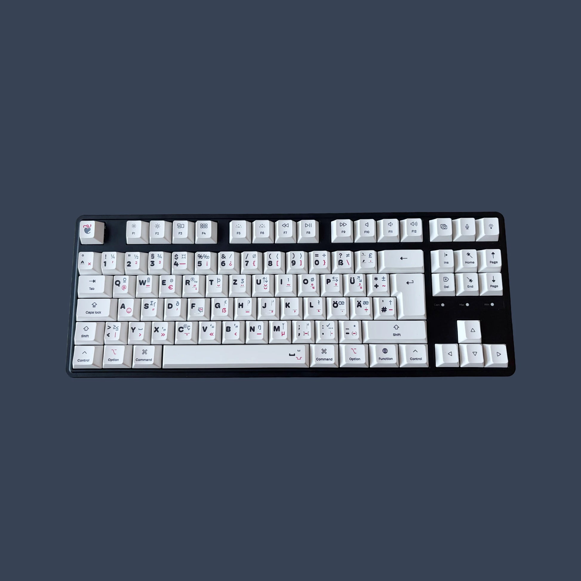 Mit der E1-Belegung und unseren Tastenkappen kommen unter anderem diese Zeichen zusätzlich und sichtbar auf die Tastatur: